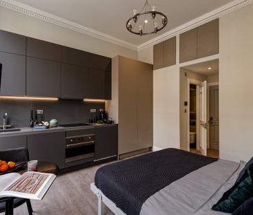 This stylish studio flat offers modern décor with wood fl...